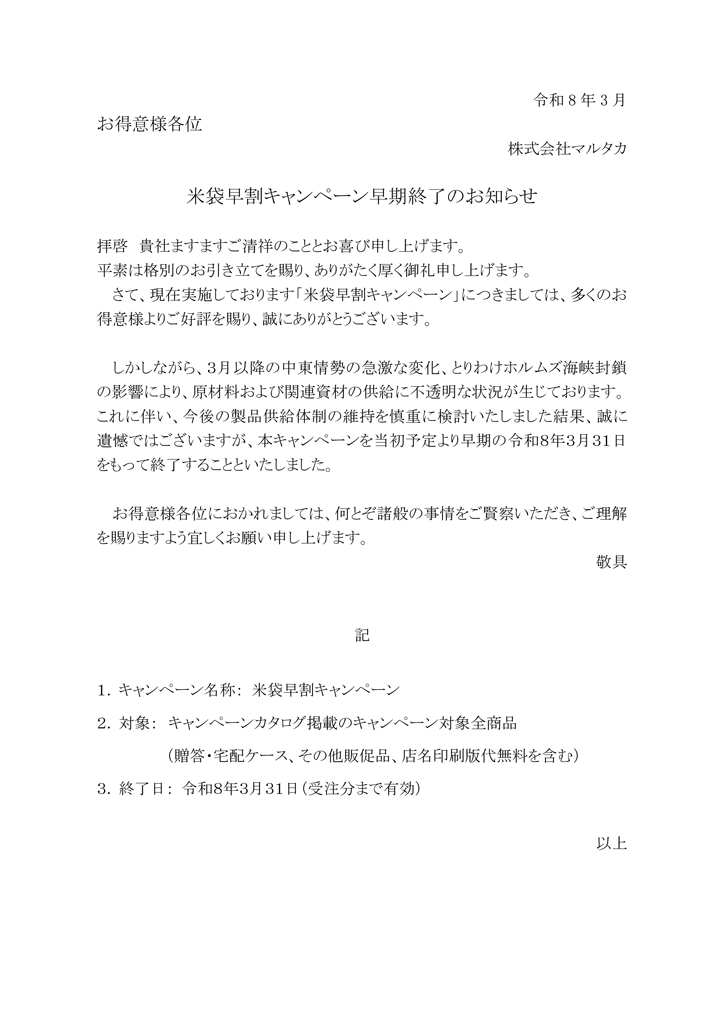 2026/03/30米袋早割キャンペーン早期終了のお知らせ(2026/3/31で終了)